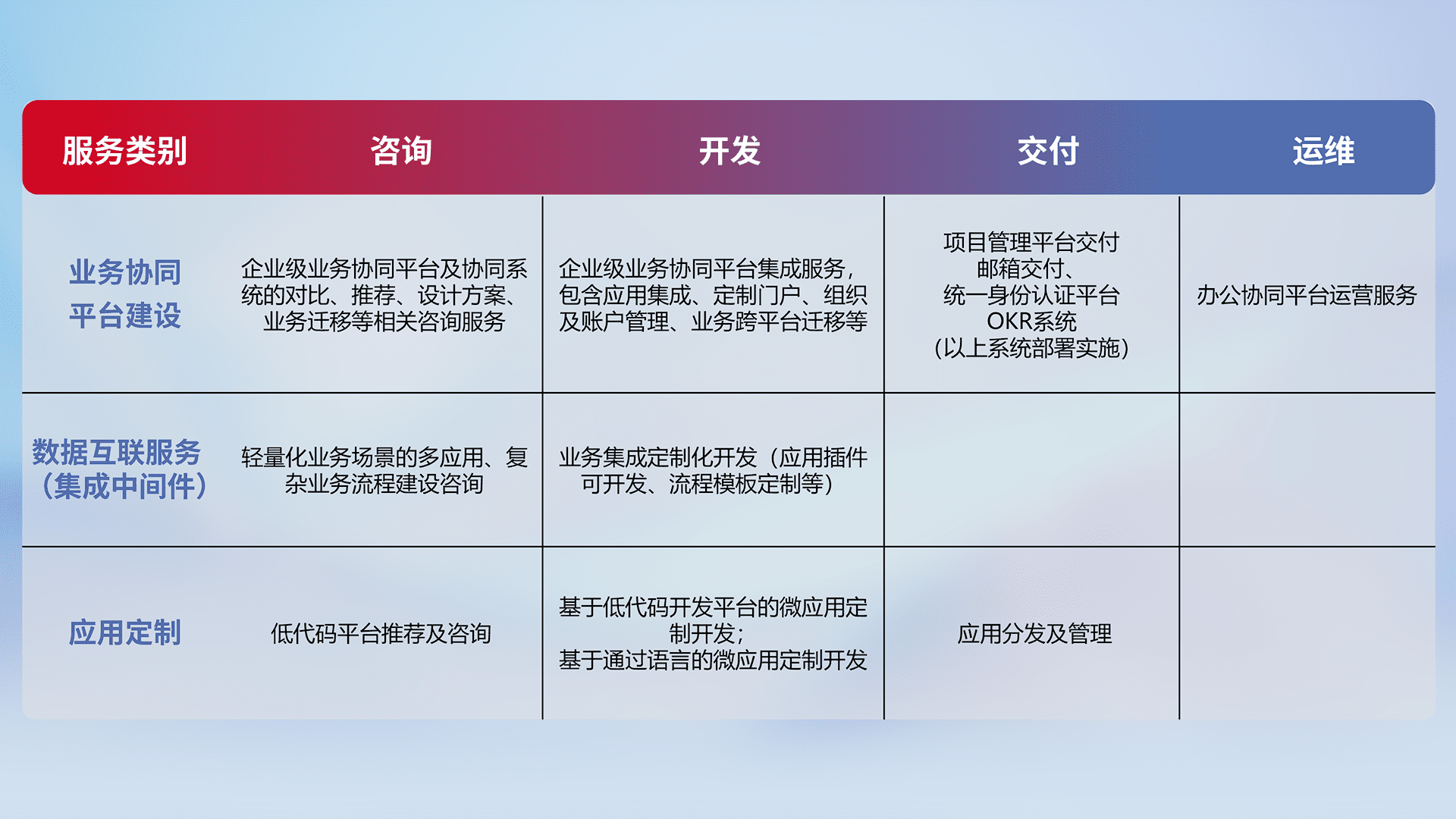 针对钉钉、、、企微、、、、IDaas等平台级产品提供产品的规划、、方案、、、、交付、、、、定制化开发等服务,,实现如统一协同办公、、、、智能客户服务、、、、混合会议管理、、、智能数据查询、、等业务场景,,,实现数字化转型。。