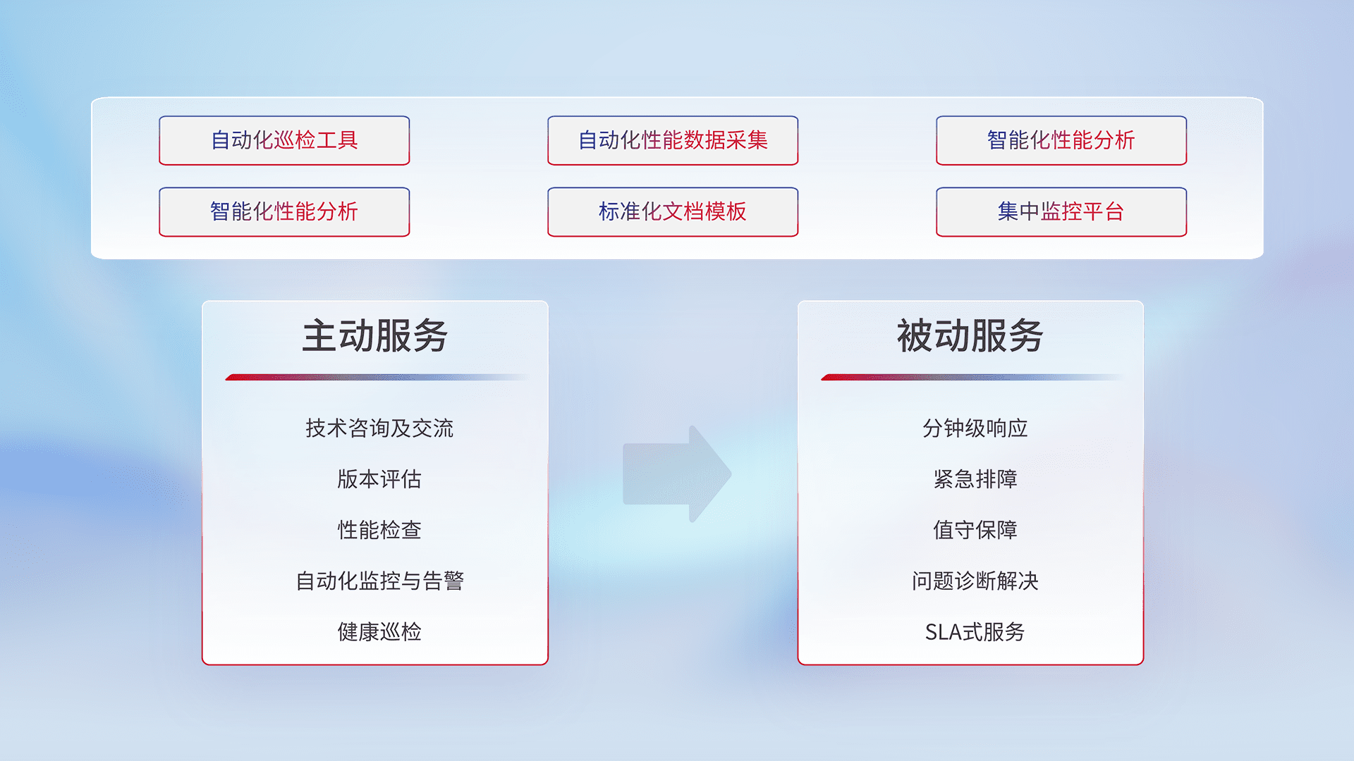 智能化工具和标准化文档,,保障服务质量,,,,提供主动服务(包含技术咨询、、版本评估、、、性能检查、、自动化监控与告警、、、、健康巡检)和被动服务包含(分钟级响应、、、、紧急排障、、值守保障、、、问题诊断解决、、SLA服务)。。。
